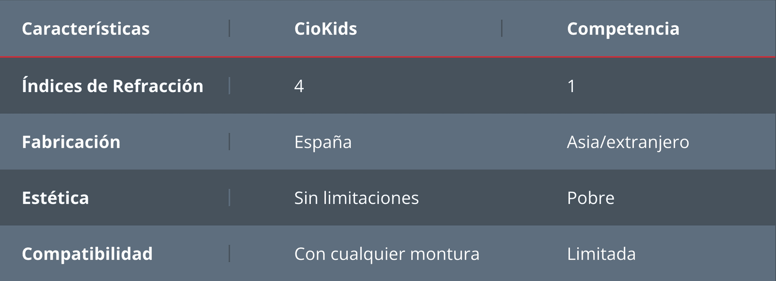 1.4, 1.5, 1.67 y 1.74, frente a la limitación de otros fabricantes con un solo índice.
